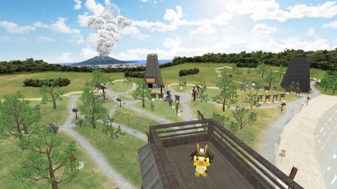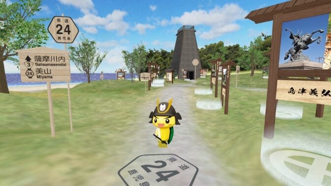 「地図空間」は、日置市の地図をギュッと縮めたようなワールドです。実在する主要な道路が再現され、その道路沿いには日置市を代表する名所を紹介する看板が点在します。また、物見やぐら(展望台)があり、登るとワールドの全体を見渡すことができ、鹿児島のシンボル「桜島」を見ることもできます。「地図空間」を散策し、日置市の魅力を感じてください!