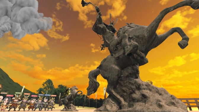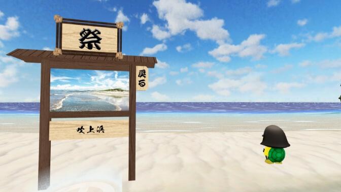 「祭空間」は、日置市の西側に広がる日本三大砂丘の一つ「吹上浜」をイメージしたワールドで、海上には古をイメージした舞台があります。舞台の反対側には鹿児島のシンボル「桜島」がそびえ立ち、砂浜には日置市を代表する武将「島津義弘」公の巨大な砂像もあります。この絶景の中で、ぜひ写真撮影をして、最高の思い出を作ってください!
