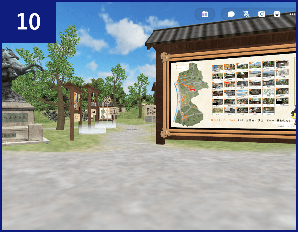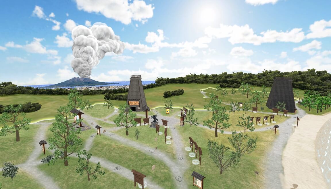 「地図空間」は、日置市の地図をギュッと縮めたようなワールドです。実在する主要な道路が再現され、その道路沿いには日置市を代表する名所を紹介する看板が点在します。また、物見やぐら(展望台)があり、登るとワールドの全体を見渡すことができ、鹿児島のシンボル「桜島」を見ることもできます。「地図空間」を散策し、日置市の魅力を感じてください!