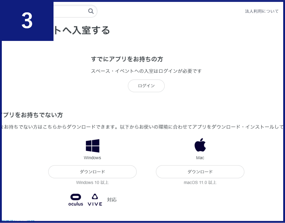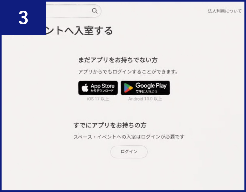 次のような公式サイトの「スペース・イベントへ入室する」画面が表示されるので、「すでにアプリをお持ちの方」下の【ログイン】ボタンをクリックします。