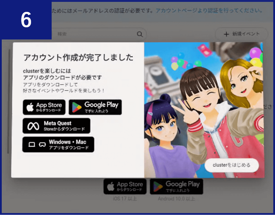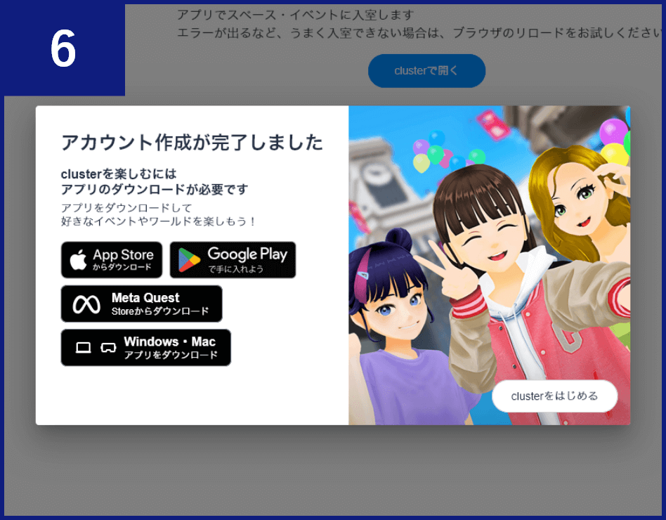 「アカウント作成が完了しました」画面が表示されるので、右下の【clusterをはじめる】ボタンをクリックします。