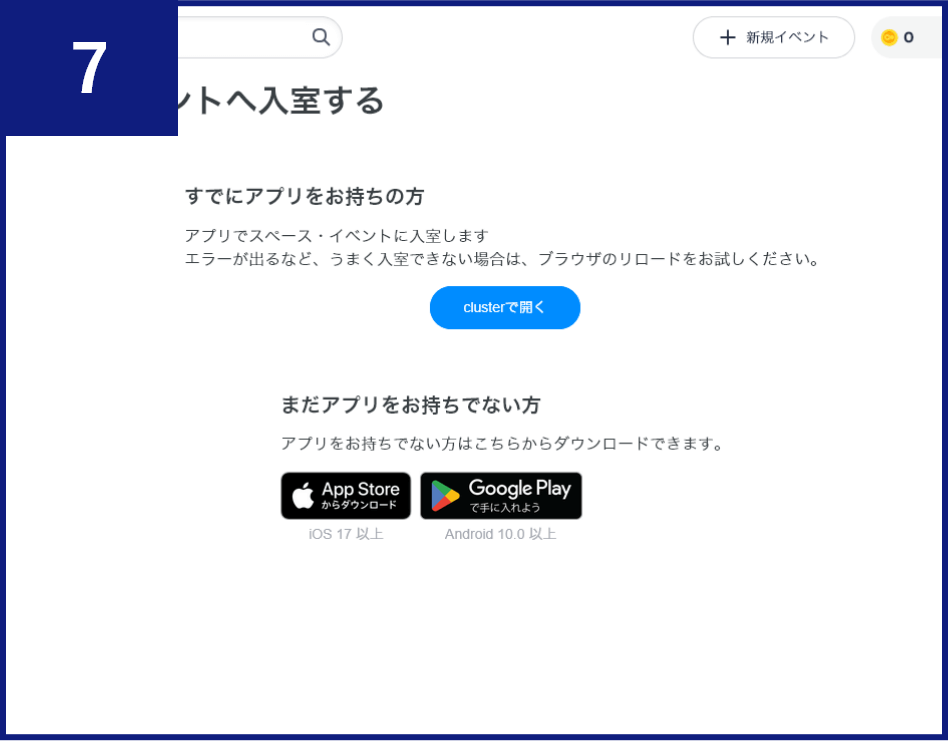 再度「スペース・イベントへ入室する」画面が表示されるので、【clusterで開く】ボタンをクリックします。