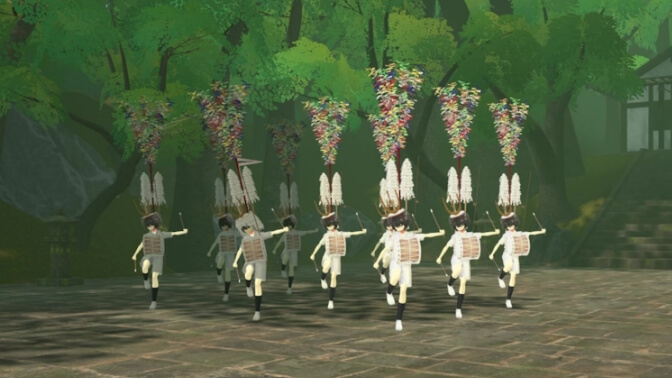 城攻めの様子を全十五段階で表現する勇壮な踊り「大田太鼓踊り」。「大田太鼓踊り」は、太鼓と鉦の音に合わせて踊り手があざやかに舞うその踊りを、観客として鑑賞するだけでなく、演者と同じ視点で踊りながら体験できるワールドです。踊り手が前後ろに移動しながら舞うそのフォーメーションもぜひご覧ください!