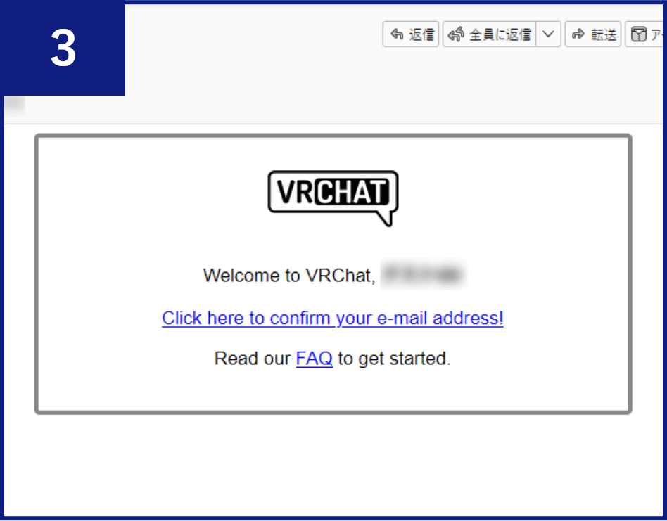 VRChatから件名「Please verify your e-mail for VRChat(メールアドレスを確認してください)」というメールが入力したメールアドレスに届くので、メール内の【Click here to confirm your e-mail address!(メールアドレスを確認するにはここをクリックしてください)】をクリックします。