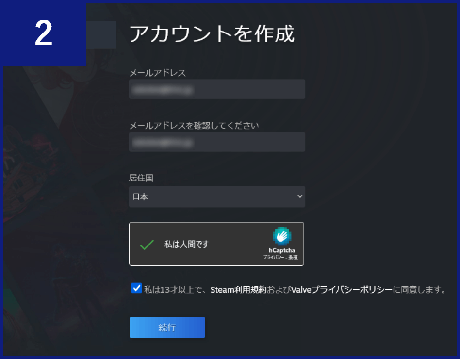 メールアドレスを入力し、「私は人間です」と「私は13才以上で、~」のチェックボックスにチェックの上、【続行】ボタンをクリックします。