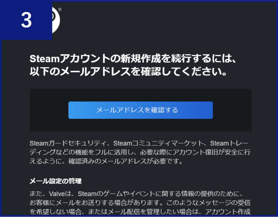 入力したメールアドレスにSteamから件名「新規 Steam アカウントのメール確認」というメールが届くので、メール内の【メールアドレスを確認する】をクリックします。