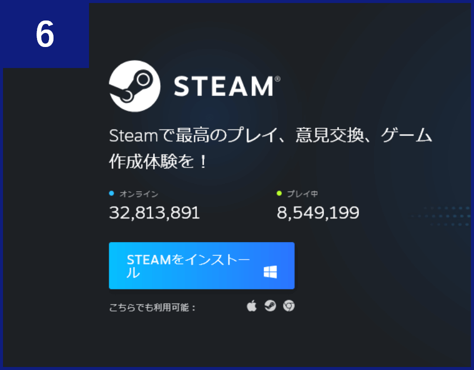 次のような画面が表示されるので、【Steamをインストール】ボタンをクリックし、アプリをダウンロードしてインストールします。