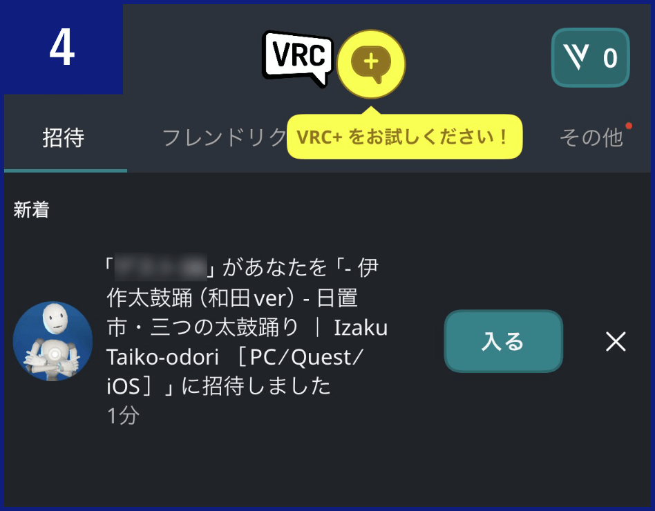 「「〇〇」があなたを「○○(ネオ日置の空間名)」に招待しました」という招待が届いているので、その招待内の【入る】ボタンを押します。