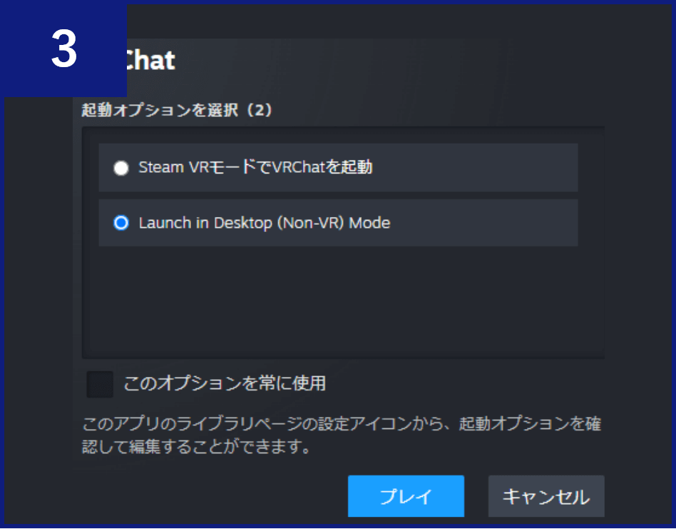「起動オプションを選択」画面が表示されるので、「Launch in Desktop (Non-VR) Mode」を選択し、【プレイ】ボタンをクリックします。