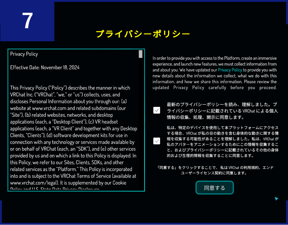 「プライバシーポリシー」画面が表示されるので、「最新の~」と「私は、~」のチェックボックスにチェックの上、【同意する】ボタンをクリックします。