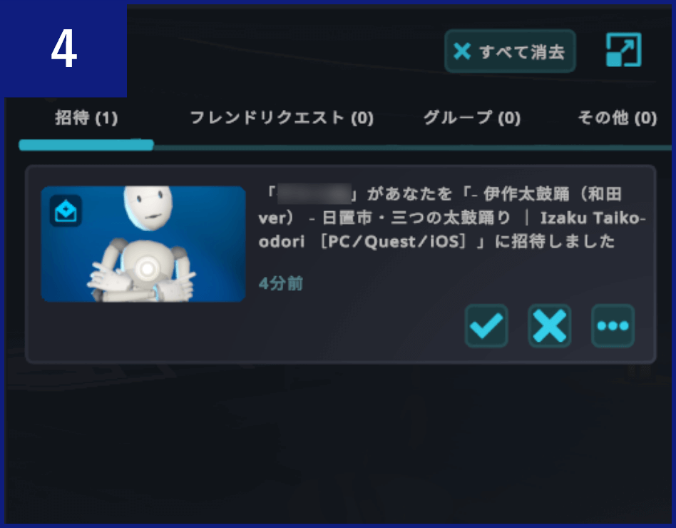 「「〇〇」があなたを「○○(ネオ日置の空間名)」に招待しました」という招待が届いているので、その招待内の【√マークのボタン】をクリックします。